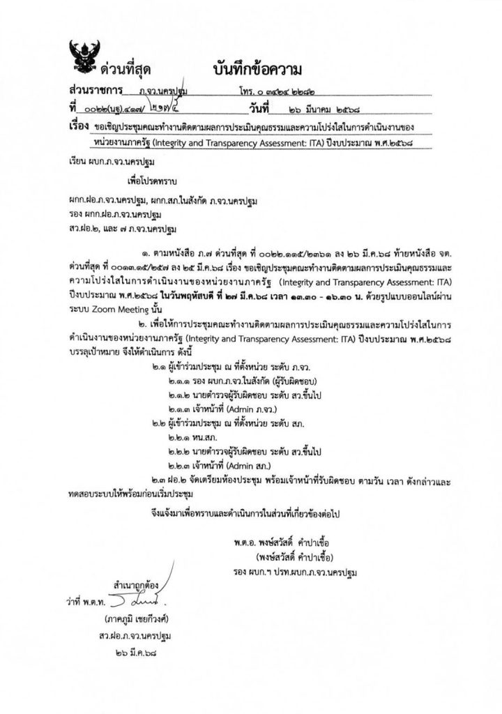 ผกก.สภ.พุทธมณฑล พร้อมด้วย สว.ธร เข้าร่วม ประชุมคณะทำงานติดตามผลการประเมินคุณธรรมและความโปร่งใสในการดำเนินงานของหน่วยงานภาครัฐ